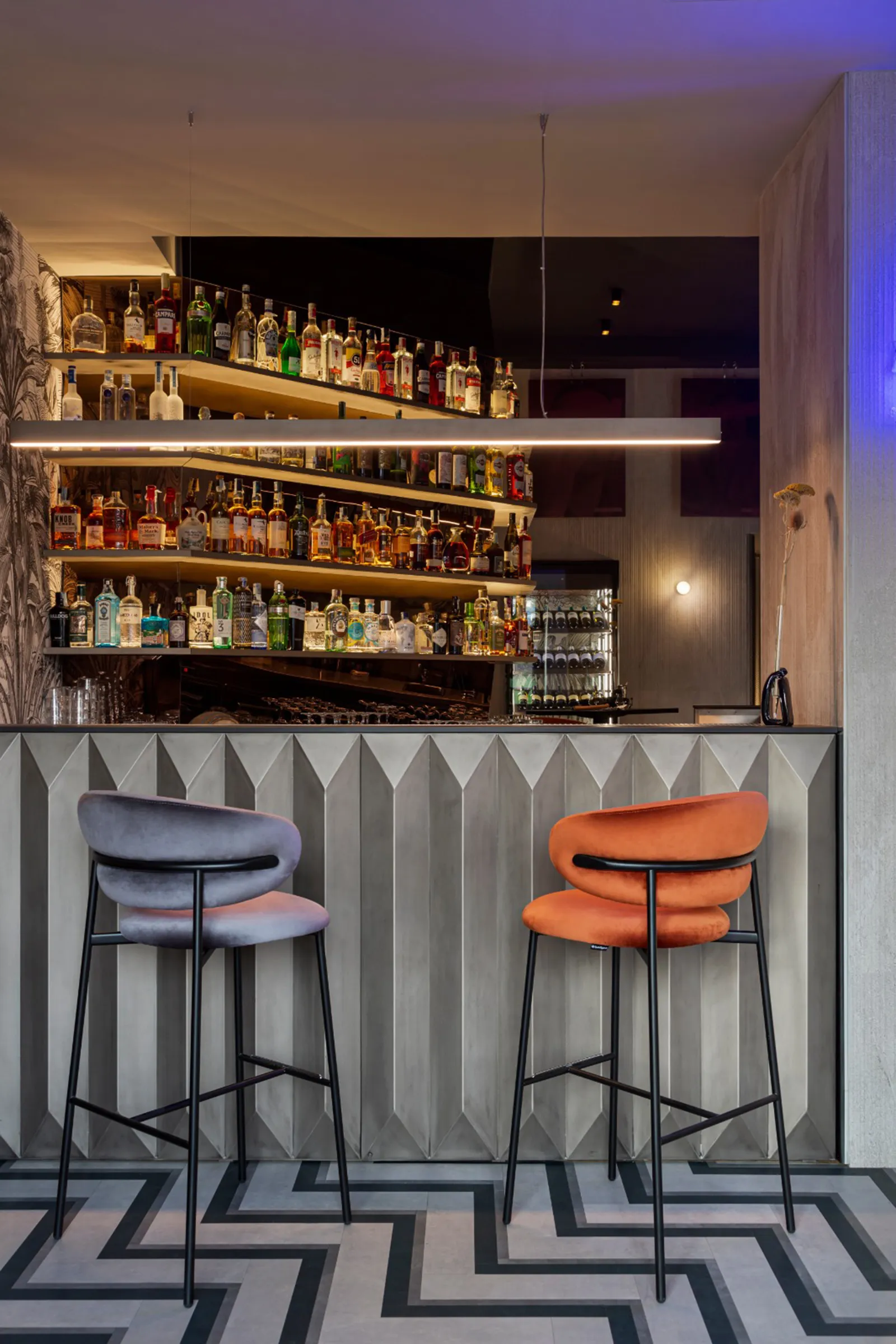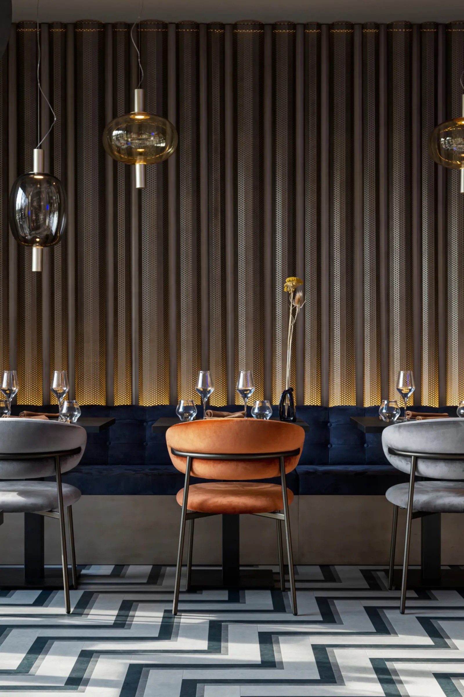 Il linguaggio cromatico scelto è quello dei colori freddi che si accendono grazie ad accostamenti più caldi e avvolgenti: crema, champagne, marron glacé, blu di Prussia, che si accostano ai velluti crema, grigio e blu notte. La ruvidità urbana del locale è ripresa dai rivestimenti 3D in gres effetto cemento nella tonalità grigio perla, mentrei wallpaper black&white rimandano a vedute naturalistiche. Per l'illuminazione tutti i lampadari sono firmati Vistosi, vetreria con più di 500 anni di storia, scelti per la particolare illuminazione che sono capaci di diffondere nella sala, contribuendo a creare un luogo chic ma allo stesso tempo informale, dove ognuno si possa sentire a proprio agio.