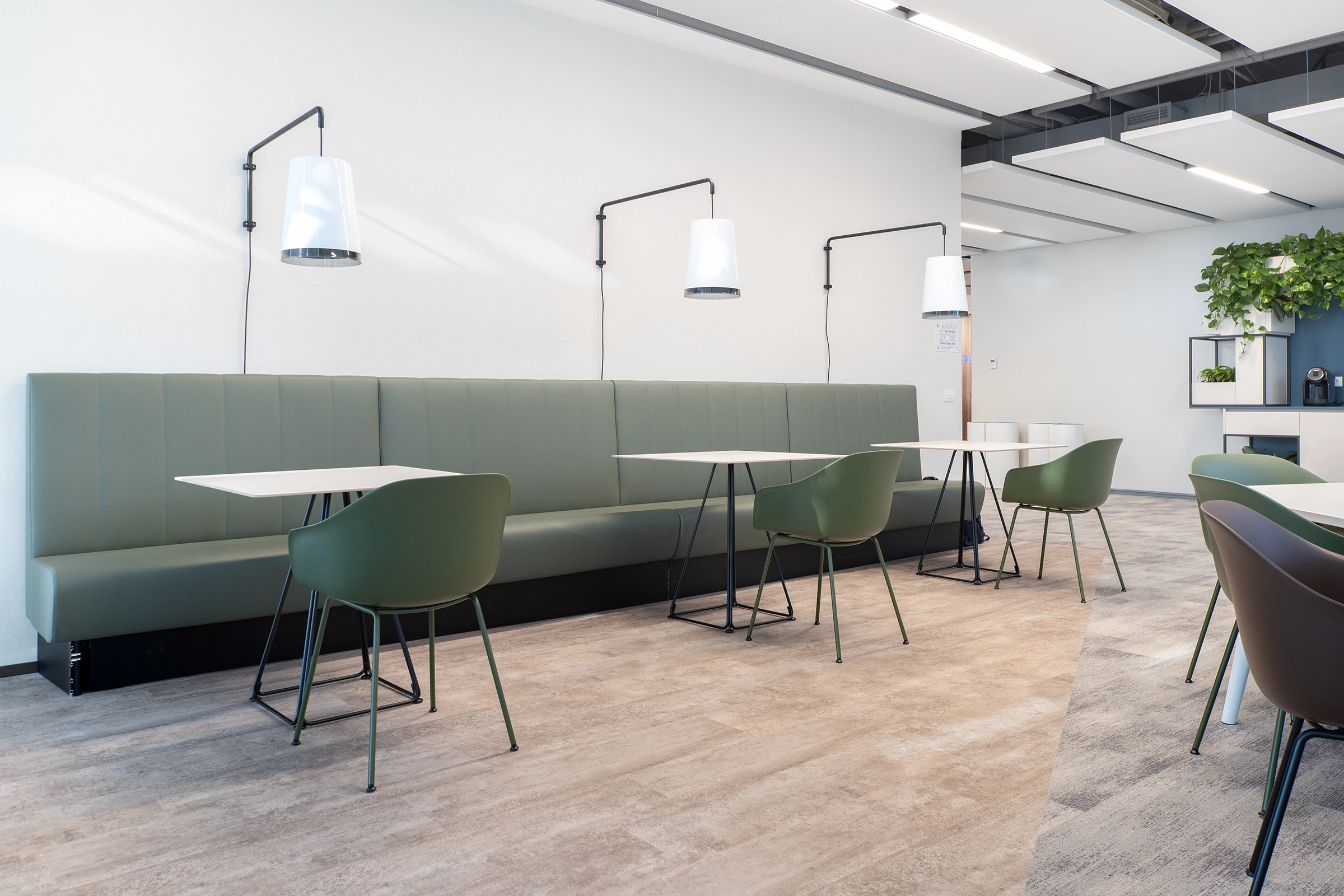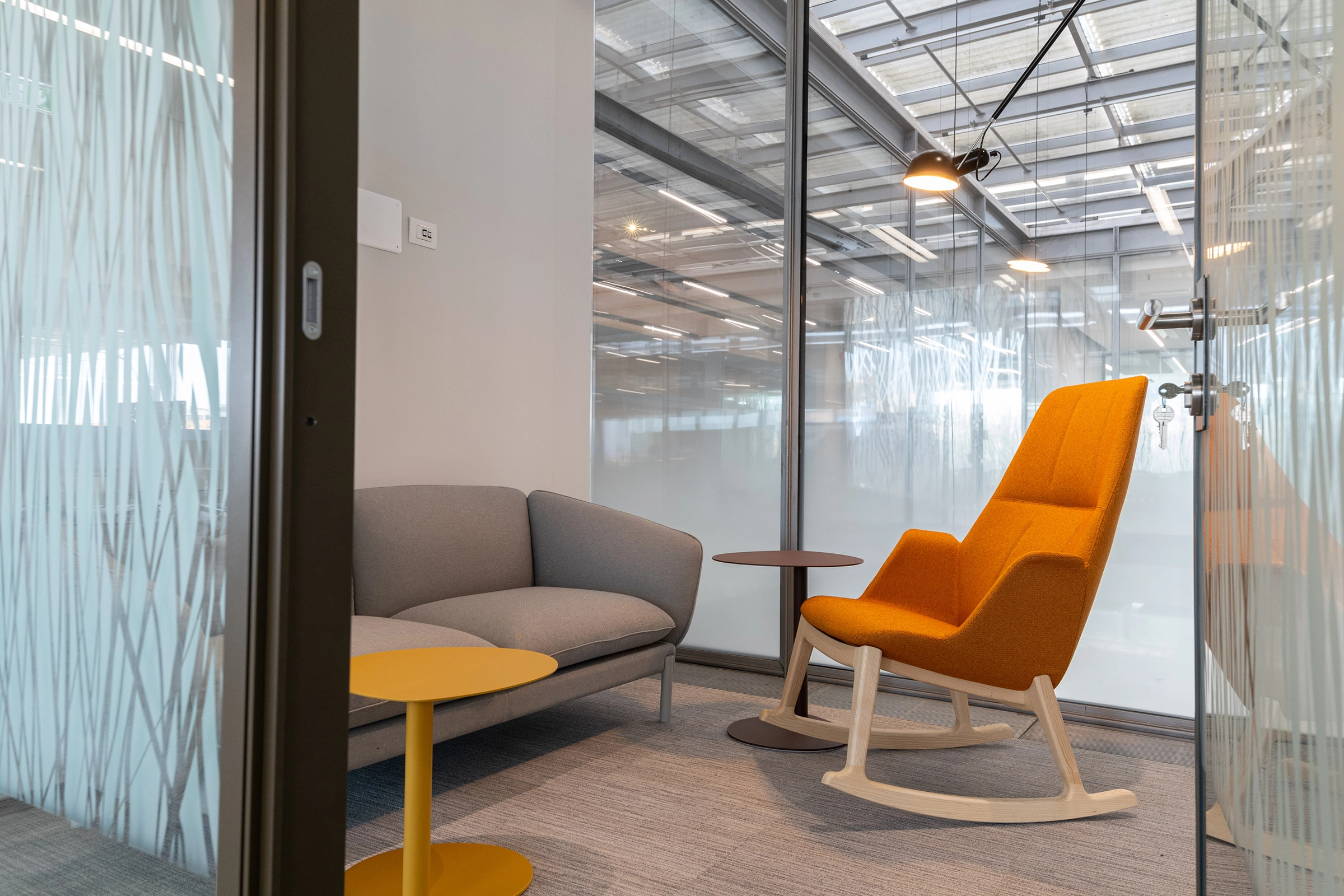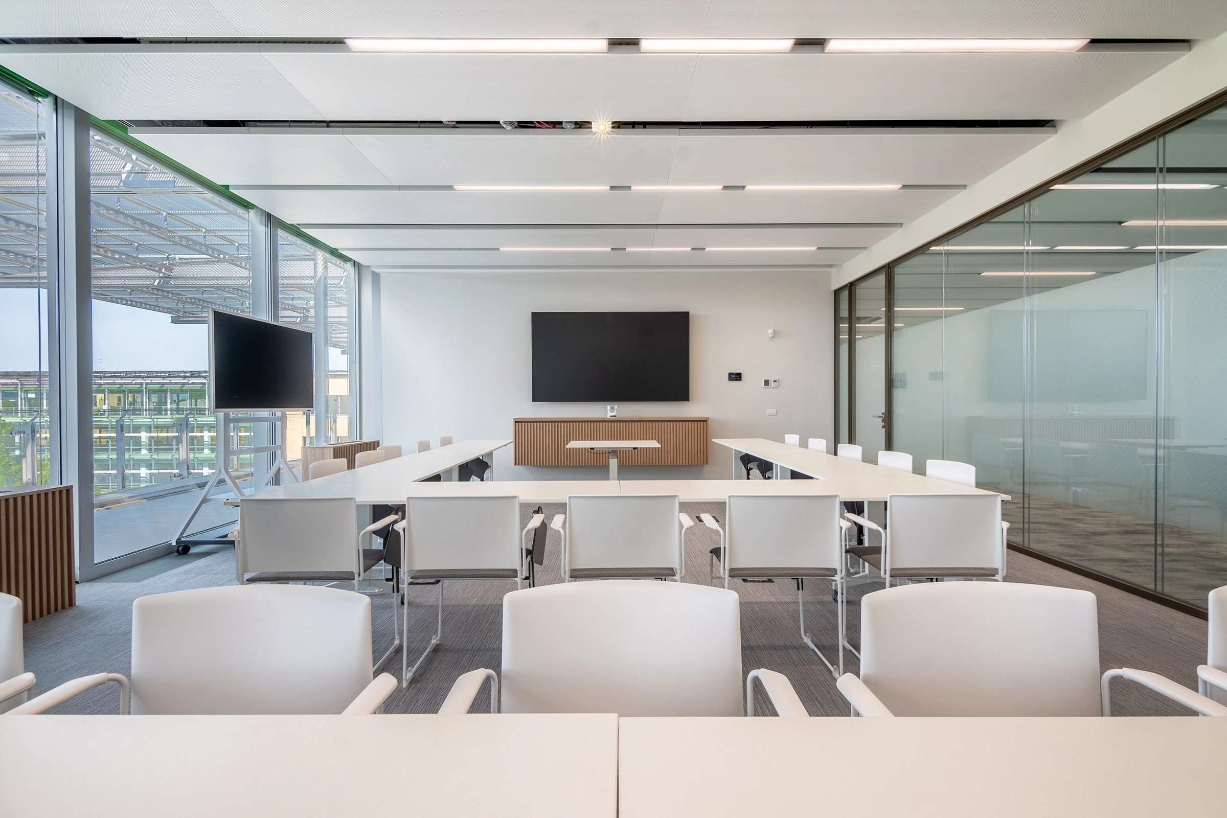 Nelle aree di rappresentanza e nelle sale riunioni l’illuminazione è un elemento discreto integrato nelle soluzioni di design. Diventa segno distintivo nelle aree relax e collaboration, ad esempio attraverso l’utilizzo di corpi illuminanti con prestazioni fonoassorbenti all’interno dell’area, break, piantane e luci da tavolo. Nei phone booths la luce diventa indiretta e soffusa.