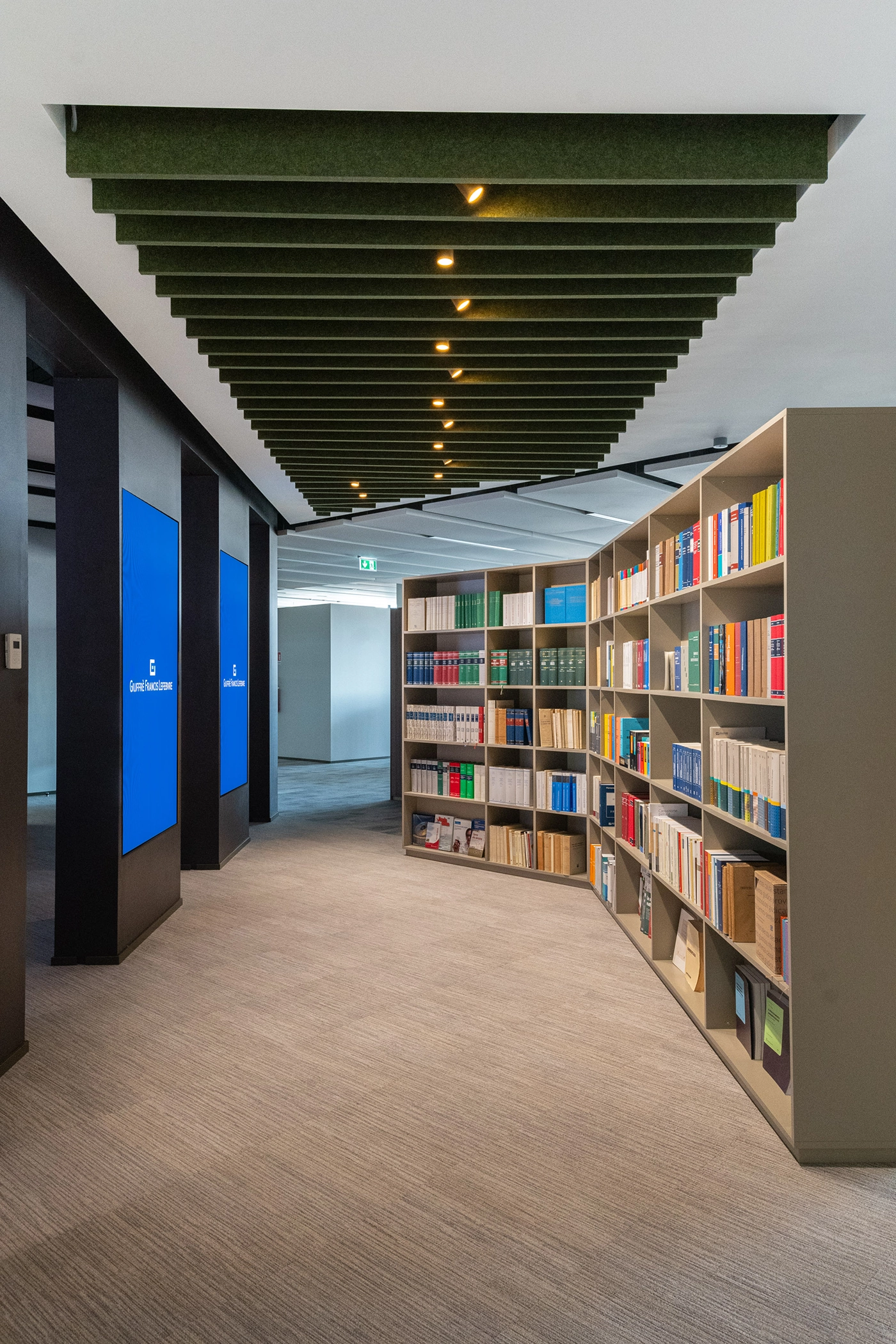 Lo spazio è stato suddiviso in due principali aree funzionali: una dedicata all’accoglienza dei clienti e un’area operativa destinata ai dipendenti e collaboratori. La creazione di un’area di rappresentanza che simboleggia l’evoluzione del prodotto, dall’editoria tradizionale alla nuova editoria digitale, è il fulcro dell’intervento. Il visitatore viene accompagnato in uno spazio digitale dai volumi iconici di Giuffrè raccolti all’interno di una libreria su misura. Il Digital Hub, con l’ampia gradonata e il led wall è l’ambiente nato per creare il parallelismo tra classico e contemporaneo, fisico e digitale. L’elevata specializzazione dell’attività editoriale di Giuffrè ha poi reso necessaria la creazione di una sala training: di dimensioni generose, pensata per ospitare corsi formativi in collaborazione con scuole e clienti. Le attività di lavoro quotidiane si articolano invece attorno al pozzo di luce centrale. Qui gli spazi sono contraddistinti da postazioni di lavoro condivise, lockers, sale riunioni di diversa dimensione, phone booths, aree di collaborazione di varie tipologie.
