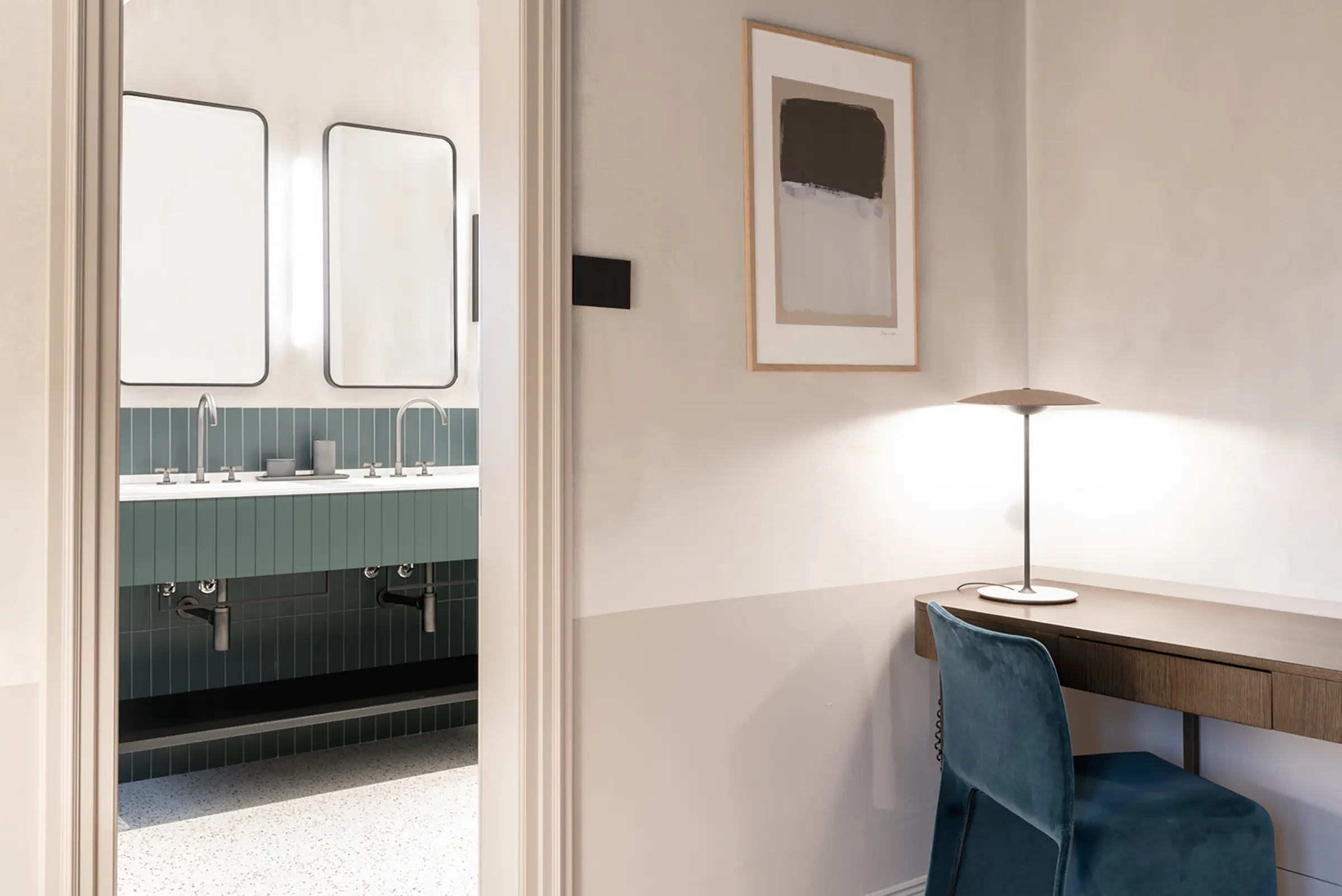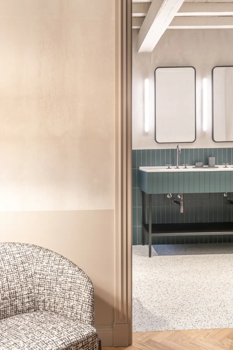 Il restauro conservativo ha riportato alla luce i colori che caratterizzavano originariamente i soffitti lignei, che sono diventati parte integrante delle scelte progettuali. Lo studio approfondito dello spettro cromatico esistente è stato il punto di partenza nella scelta di finiture e materiali interni. Tutti gli ambienti sono caratterizzati da una progettazione su misura dell’arredo, a cui vengono accostati altri arredi di design, illuminati da lampade iconiche, nella continua ricerca di armonia tra elementi storici e scelte contemporanee.