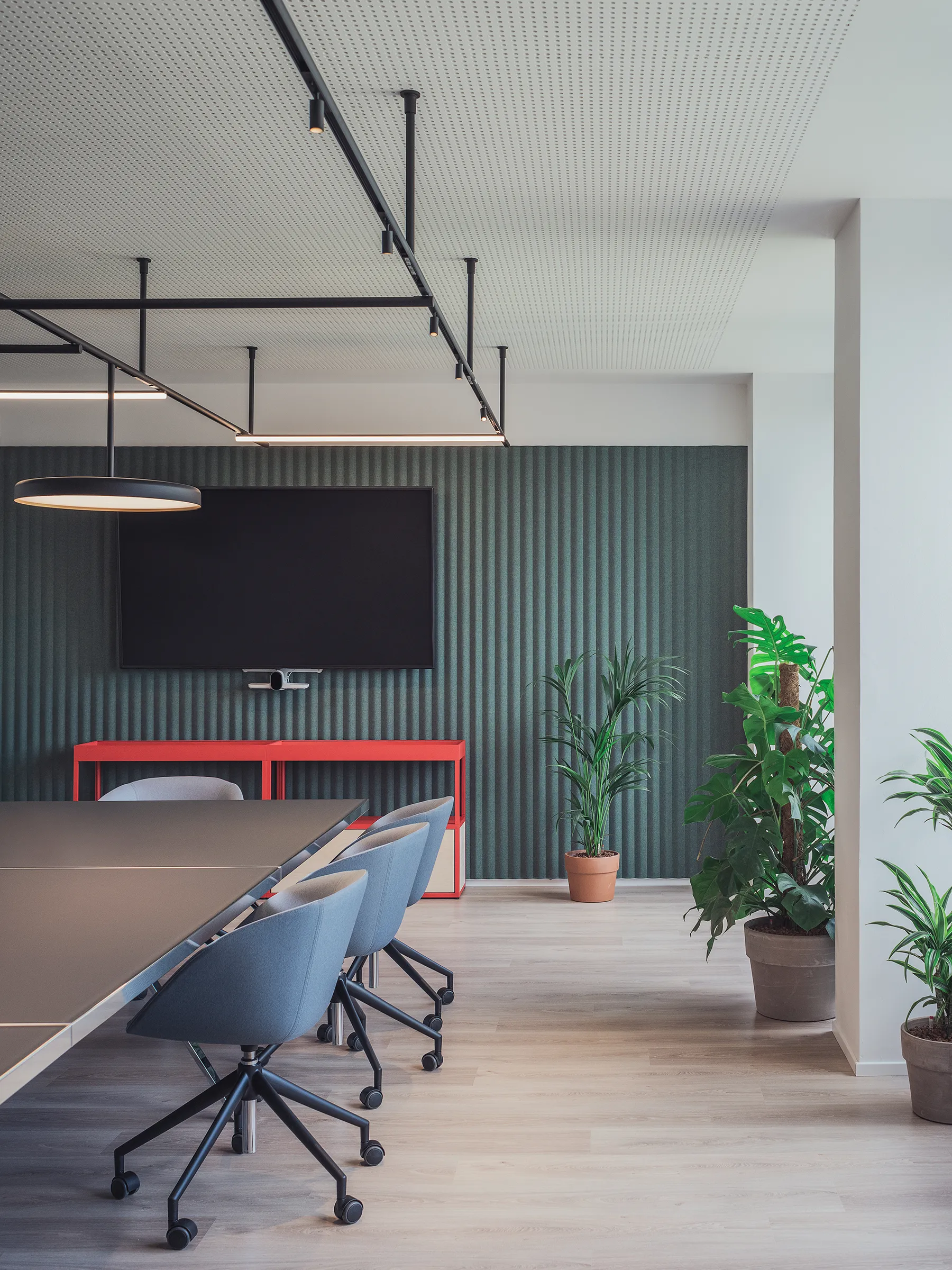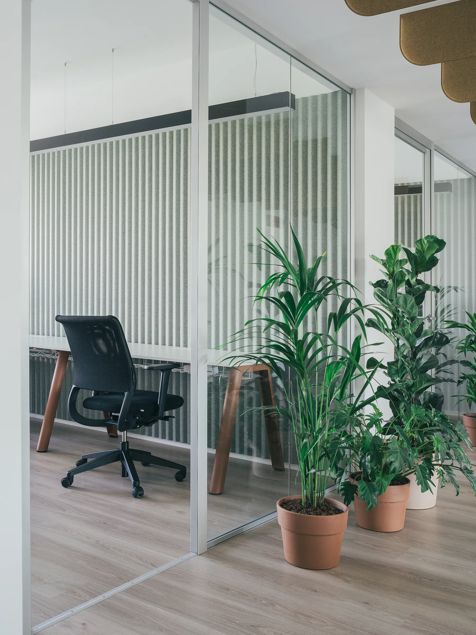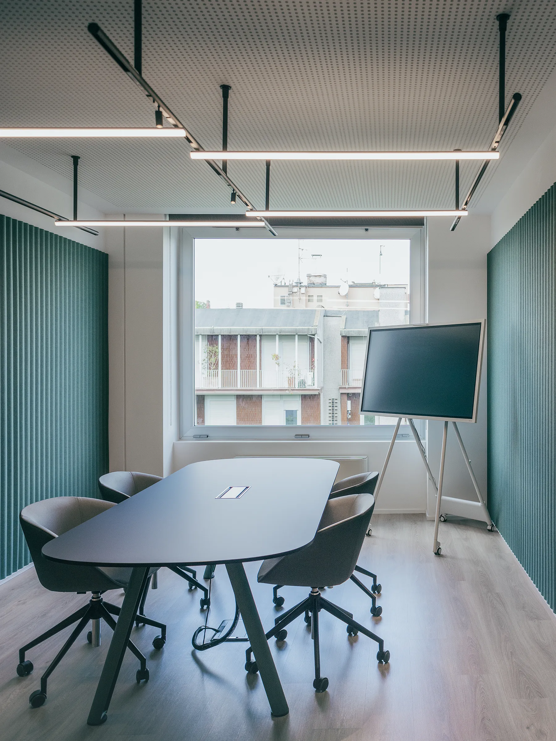 Il design biofilico, ovvero la ricerca di un’integrazione tra natura e ambiente costruito, pervade uffici e sale riunioni lavorando come filtro naturale tra gli spazi e tessuto connettivo tra gli ambienti, migliorando: i) la qualità dell’aria tramite una scelta di essenze in vaso areo purificanti; ii) riducendo la propagazione dei rumori; iii) riducendo lo stress; iv) stimolando concentrazione e produttività. L’arredo operativo e meeting, declinato ad hoc in base alle funzioni richieste, presenta una precisa gamma di colori e finiture che dialogano armonicamente tanto con l’ambiente interno quanto con il paesaggio milanese, incorniciato dalle aperture in facciata. Un rapporto di inside-out che radica l’intervento nel contesto, rendendo gli interni quasi estensioni degli ambienti esterni e viceversa. Un ufficio vitale, dove gli elementi naturali, le scelte cromatiche e quelle dei materiali sono state pensate per il benessere di chi gli spazi li vivrà quotidianamente.