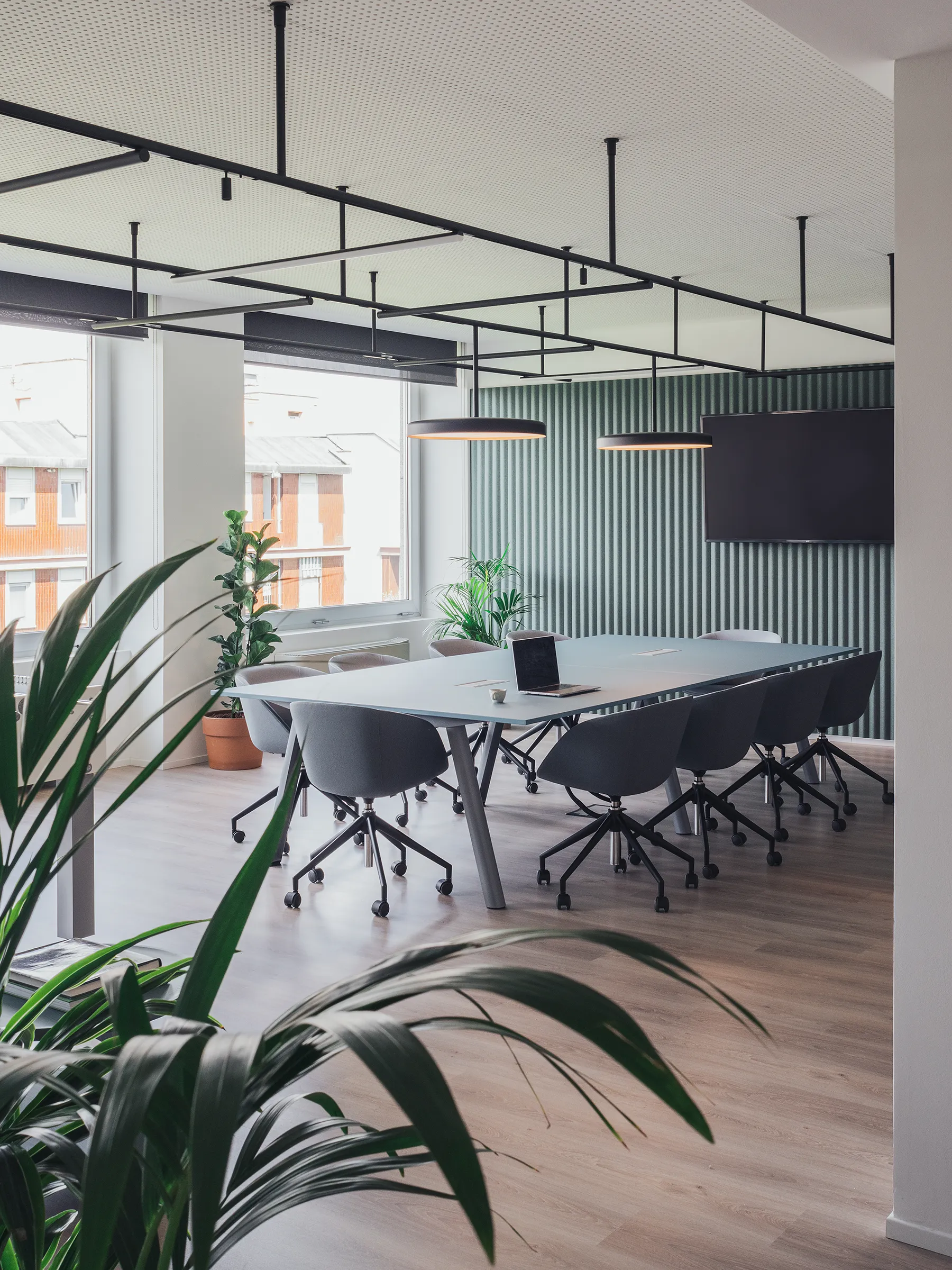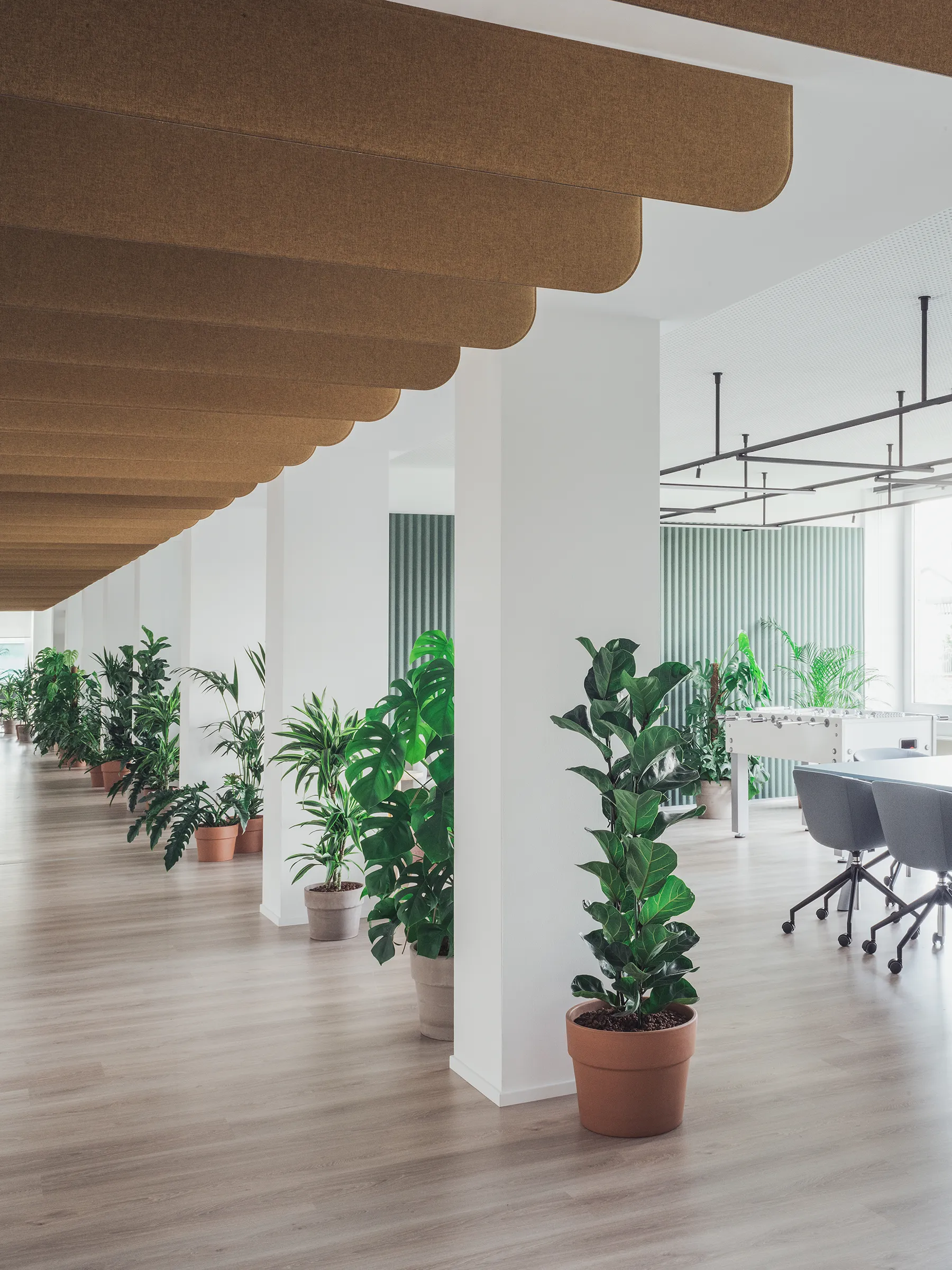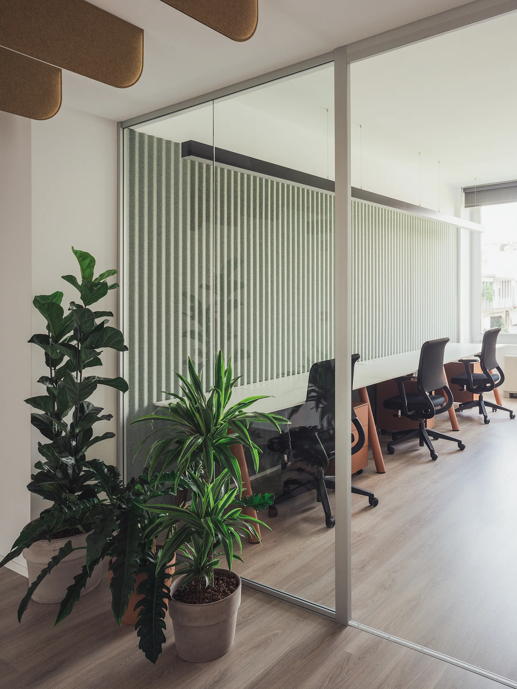 Il design biofilico, ovvero la ricerca di un’integrazione tra natura e ambiente costruito, pervade uffici e sale riunioni lavorando come filtro naturale tra gli spazi e tessuto connettivo tra gli ambienti, migliorando: i) la qualità dell’aria tramite una scelta di essenze in vaso areo purificanti; ii) riducendo la propagazione dei rumori; iii) riducendo lo stress; iv) stimolando concentrazione e produttività. L’arredo operativo e meeting, declinato ad hoc in base alle funzioni richieste, presenta una precisa gamma di colori e finiture che dialogano armonicamente tanto con l’ambiente interno quanto con il paesaggio milanese, incorniciato dalle aperture in facciata. Un rapporto di inside-out che radica l’intervento nel contesto, rendendo gli interni quasi estensioni degli ambienti esterni e viceversa. Un ufficio vitale, dove gli elementi naturali, le scelte cromatiche e quelle dei materiali sono state pensate per il benessere di chi gli spazi li vivrà quotidianamente.